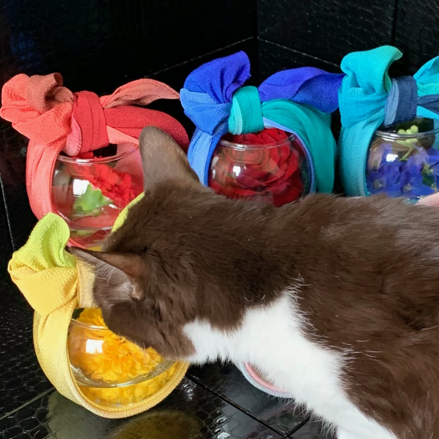 香りのするお花やアロマキャンドル、石鹸をコップに入れてシルクふろしきでくるみ、 一晩その香りをちりめんにお移し下さい。